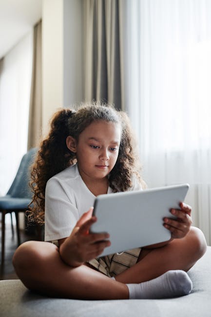 Young girl with curly hair using a tablet indoors, sitting cross-legged.